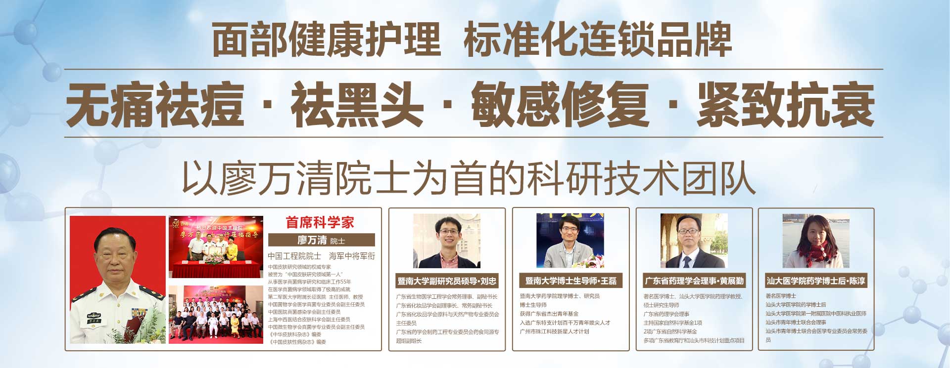 中心特聘請中國工程院院士、中國肌膚健康領域權威專家廖萬清教授擔任雅蒂首席科學家,并攜手汕頭大學,暨南大學在皮膚學、藥學、干細胞學等不同領域的數十名名專家博士,先后創立省院士專家工作站與青年博士專家工作站,研發產品榮獲多項國家專利。